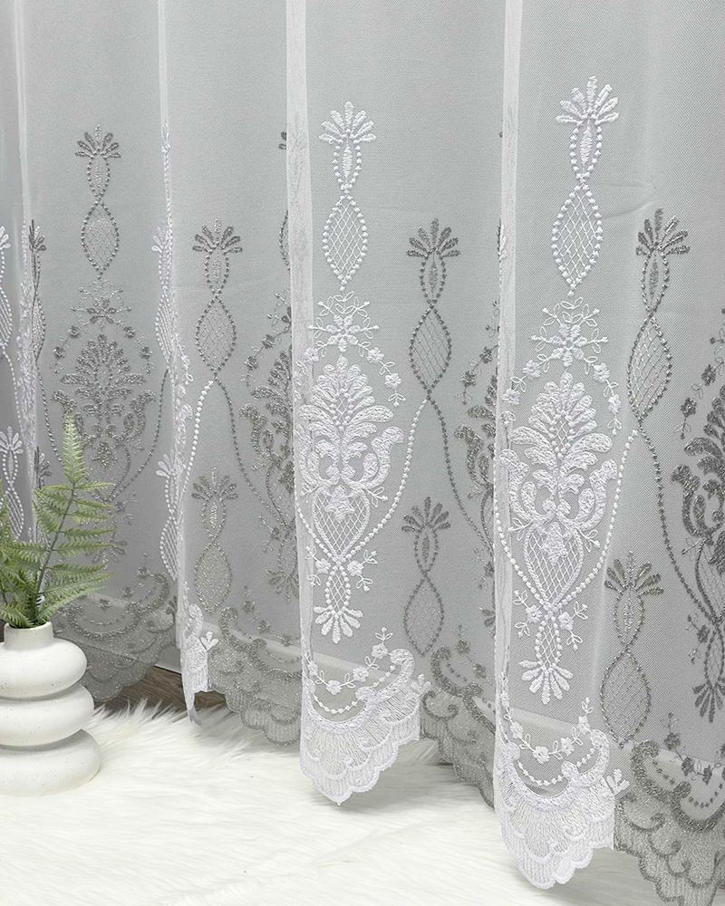 Izšūta sieta tipa dienasgaismas aizkaru audums ir augstas kvalitātes turku audums, kam raksturīgs smalks raksts, vieglums un elegance. Sieta struktūra ļauj gaismai maigi iekļūt telpā, radot plašuma un komforta sajūtu. Šis audums ir lieliski piemērots tiem, kas novērtē gaišu, harmonisku un estētisku interjeru.