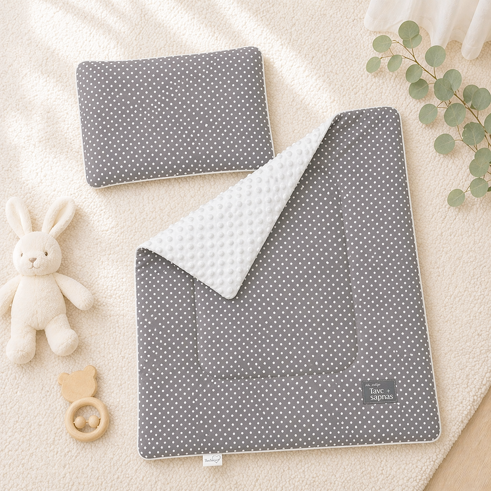 Viena puse – īpaši mīksts minky audums, kas sniedz siltumu un patīkamu sajūtu. Otra puse – dabīga, elpojoša kokvilna, kas ir saudzīga pret jutīgu mazuļa ādu. Iekšpusē – kokvilnas pildījums, kas padara komplektu vieglu, drošu un piemērotu pat pašiem mazākajiem.