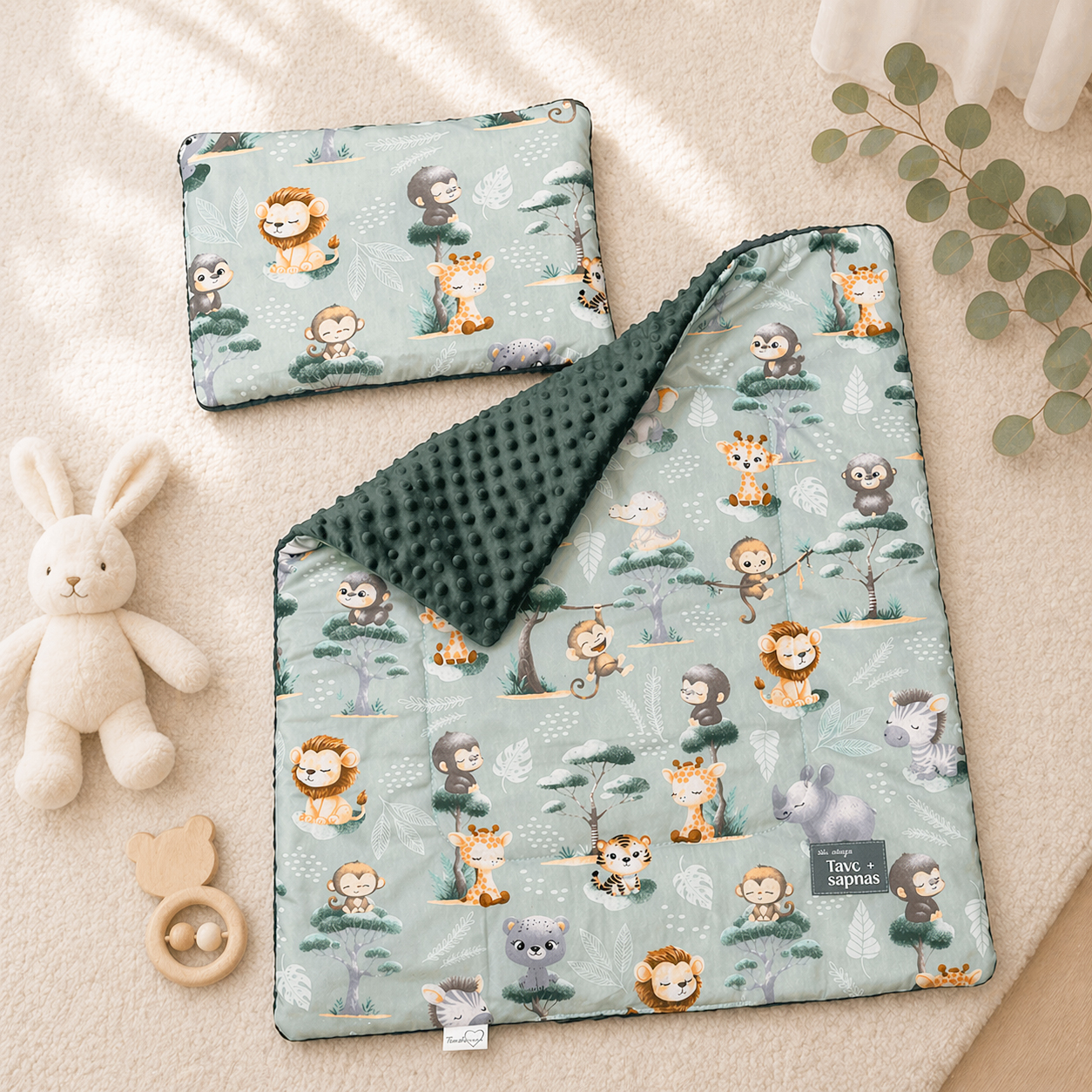 Viena puse – īpaši mīksts minky audums, kas sniedz siltumu un patīkamu sajūtu. Otra puse – dabīga, elpojoša kokvilna, kas ir saudzīga pret jutīgu mazuļa ādu. Iekšpusē – kokvilnas pildījums, kas padara komplektu vieglu, drošu un piemērotu pat pašiem mazākajiem.
