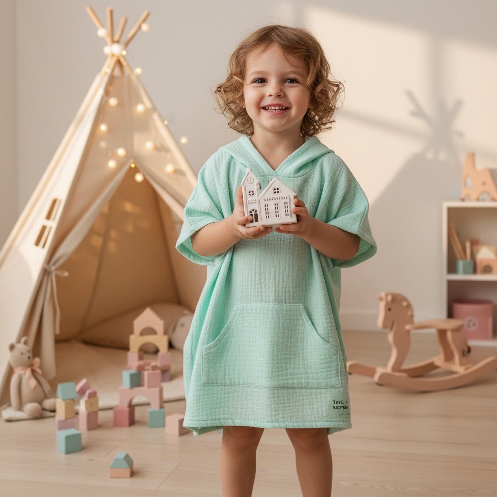Ja gatavojaties ar bērniem ceļot uz jūru, ezeru vai vienkārši baudīt baseina priekus, šāds dvielis-pončo kļūs par neaizstājamu priekšmetu ceļojuma somā. Šis pončo ir izgatavots no dabīgas kokvilnas muslīna. Muslīns ir plāns, viegls un mīksts kokvilnas audums. Tas ir audums bez mākslīgām piedevām, tāpēc īpaši piemērots lietošanai zīdaiņiem un maziem bērniem un ir pielāgots viņu jutīgajai ādai.