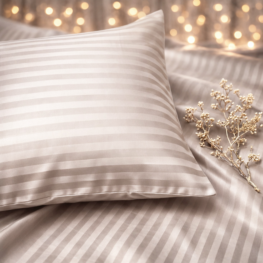 Šī spilvendrāna ir izgatavota no augstas kvalitātes kokvilnas satīna, kas izceļas ar savu maigumu, gludu virsmu un smalku spīdumu. Audums maigi pieguļ ādai, neradot kairinājumu vai diskomfortu. Svītrainais dizains piešķir eleganci un modernitāti, vienlaikus saglabājot vieglu, nomierinošu toni. Kokvilnas satīns labi elpo, tāpēc jutīsieties ērti gan siltās, gan vēsākās naktīs.