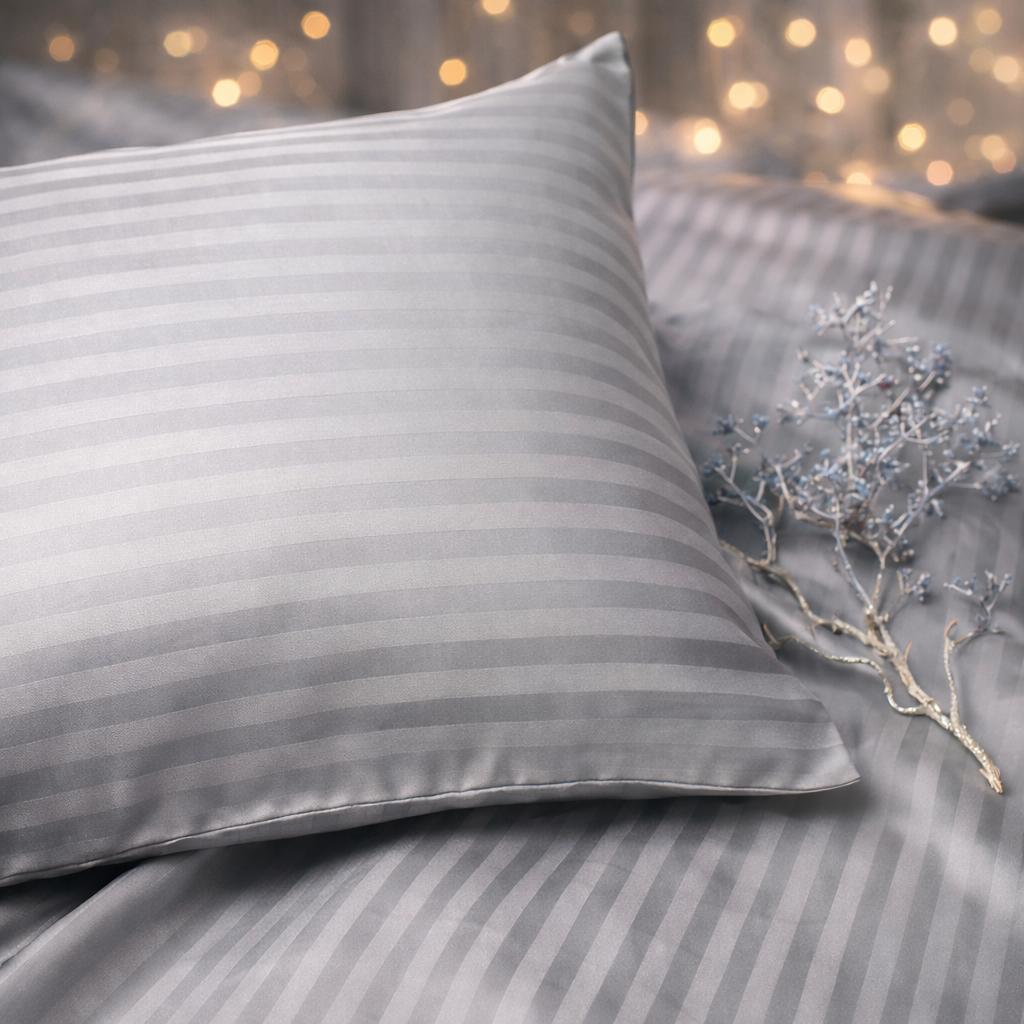 Šī spilvendrāna ir izgatavota no augstas kvalitātes kokvilnas satīna, kas izceļas ar savu maigumu, gludu virsmu un smalku spīdumu. Audums maigi pieguļ ādai, neradot kairinājumu vai diskomfortu. Svītrainais dizains piešķir eleganci un modernitāti, vienlaikus saglabājot vieglu, nomierinošu toni. Kokvilnas satīns labi elpo, tāpēc jutīsieties ērti gan siltās, gan vēsākās naktīs.